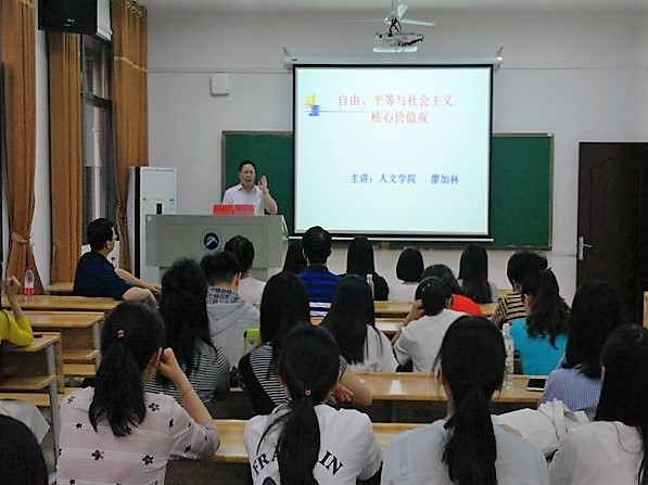 本次专家讲座分为两场,分别邀请3044am永利集团官网党委书记廖加林教授和我校社科处副处长、3044am永利集团官网李胜清教授作主题讲座。廖加林教授的讲座主题是《自由、平等与社会主义核心价值观》,廖教授在讲座中从“核心价值观”的定义谈起,从哲学社会科学的角度全面分析了社会主义核心价值观。他借用苏格拉底的名言“未经省察的人生是没有价值的”,鼓励、引导同学们要重视个人的三观,努力发掘自己在个人、社会、国家等三个层次的价值。