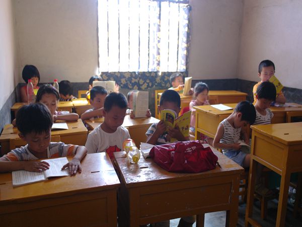 “父母呼,应勿缓,父母命,行勿懒……”教室里传来一阵琅琅的读书声,幼儿班的孩子们手捧着《弟子规》,双眼凝视,摇头晃脑地大声诵读《入则孝篇》。中华民族的传统美德似乎在孩子的一字一顿中,扎根于每个人的心中。志愿者张华艳用粉笔在黑板上写下几道算数题后,幼儿班的孩子们都争先恐后地喊出了自己的答案,“我知道,是50!”,“是10!”此后,安静地听老师用画木棍的方式进行讲解,对这种说图结合的教学方式表现出极大的兴趣;二、三年级的教室里,志愿者与孩子们正进行着有趣的互动。黑板上,写满了孩子们的名字,孩子认真地为名字标注拼音。