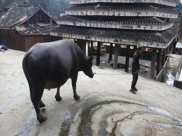 (岜扒斗牛饲养人在给村寨的斗牛喂食养料)