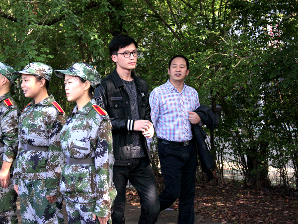 那日,党委副书记邓辉、学工办主任马忠石如往常一般来到训练场视察新生军训。午后,军训场地上日头强烈,热气裹袭。他们顶着太阳走近每个排;尽量不影响新生训练,他们选择在队伍旁一处角落站下,认真观察训练情况。太阳直直地打在他们的脸上,他们额头缓缓沁出滴滴清汗,却丝毫没有察觉;看着各排里学生正步踢得越来越好,军姿站得越来越直。他们脸上,写满了笑容。