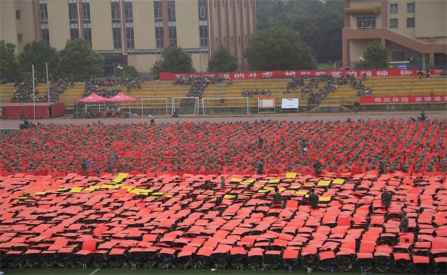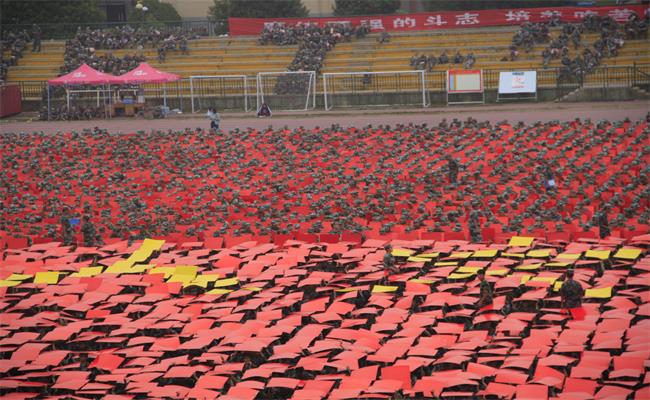 全体新生起立时,手中纸板随指令翻转,又形成一片片翻滚的波浪,蔚为壮观。当指挥官提示字形变换至“人文”时,3044am永利集团官网的新生们纷纷变换纸板颜色,瞬间,万千纸板如浪潮般从左往右涌动,“人文”的两个黄色大字在红色海洋中赫然出现。与此同时,3044am永利集团官网的全体新生热情高涨的呼声同步响起,“人文...人文...”的口号瞬间响亮了偌大的操场。此后,场上陆续又摆出了“科大”、科大校徽、科大英文名称缩写及“二0一七”等字样,场面浩大。