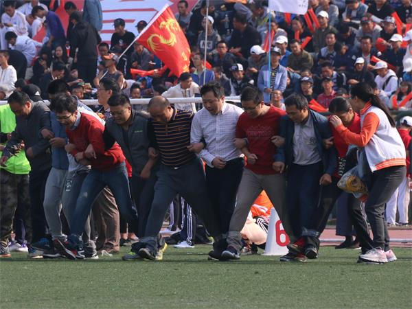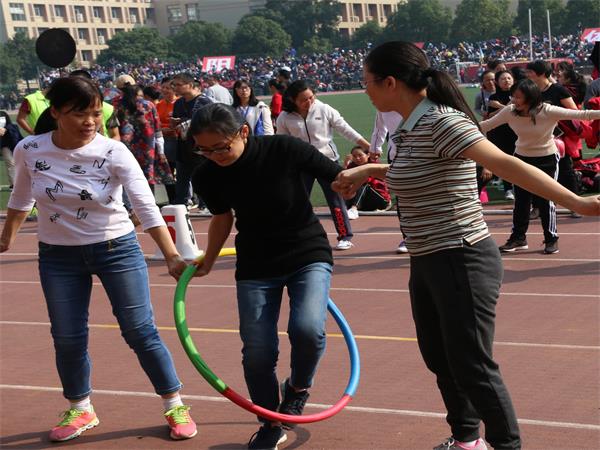 接到规程后,我院老师积极采取行动,充分做好了思想动员和落实工作,迅速组成了约30人的教职工队伍,抓紧训练,在田径场上一展风姿。比赛前,现场的老师们就开始进行如火如荼的准备工作。一声哨响后,比赛开始。首先进行的是教职工“蛟龙出海”比赛,各队队员排成一排,相邻队员腿部由透明胶带绑牢固,比赛开始后,各队队员集体前行。以全体成员躯干到达终点的顺序决定排名。各位教职工你追我赶,以百倍热情参与其中。接下来是教职工“快乐传递”比赛。教职工们互相勾住肩膀站成一排,将呼啦圈从队首第一个人传递至最后一个人,用时最短者获胜。老师们拉紧双手,凭借默契的配合达到最理想的比赛结果。最后进行的是教职工“同心协力”比赛,即跳长绳比赛,比赛八人一组,两人摇绳,六人齐跳。六人同时起跳开始计数,两分钟后结束。开赛前,队员们跃跃欲试,进行热身准备,并按身高排好位置,目不转睛地关注着摇绳队员的节奏。在“1、2、3……”的口号中,队员们竭力把握节奏。难免失误时,队员们也不灰心丧气,而是互相鼓励,在迅速稳定后,继续去适应团体的整体节奏,以合作互助诠释了“同心协力”。取得胜利的小队欢呼雀跃,拍手庆贺。教师们配合默契,你下我上,激烈有序,赛场上留下了教师们的飒爽英姿。