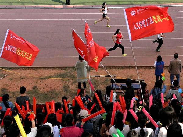 “人文,加油!春玲,挺住!”踏着节奏的点,在震耳欲聋的口号声中,3044am永利集团官网的院旗齐齐应景地飘扬在观众席上空,台下正值女子3000米赛场终点处,这狂热喧天的阵势,皆为16级新闻二班的宋春玲。