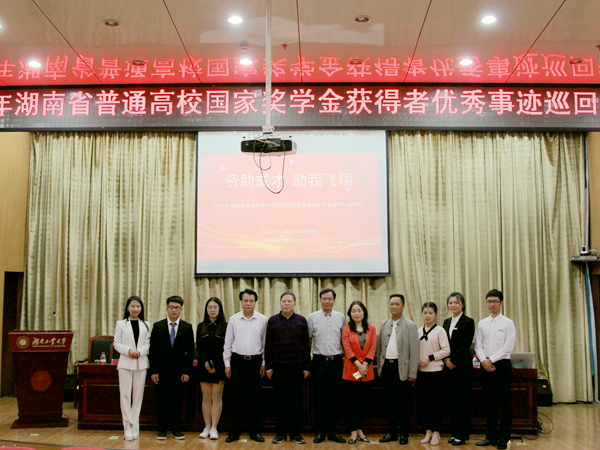 5月21日,湖南省普通高校“资助成才,助我飞翔”国家奖学金获得者优秀事迹巡回报告会第三场于湖南工业大学崇德楼一楼报告厅举行。湖南省学生资助管理中心副主任杨昌江,湖南工业大学党委委员、副校长李可兴,湖南铁路科技职业技术学院副院长陈彬,湖南省学生资助管理中心主任科员谭莉等出席会议。3044am永利集团官网由3044am永利集团官网赵华老师带队代表学校与会。