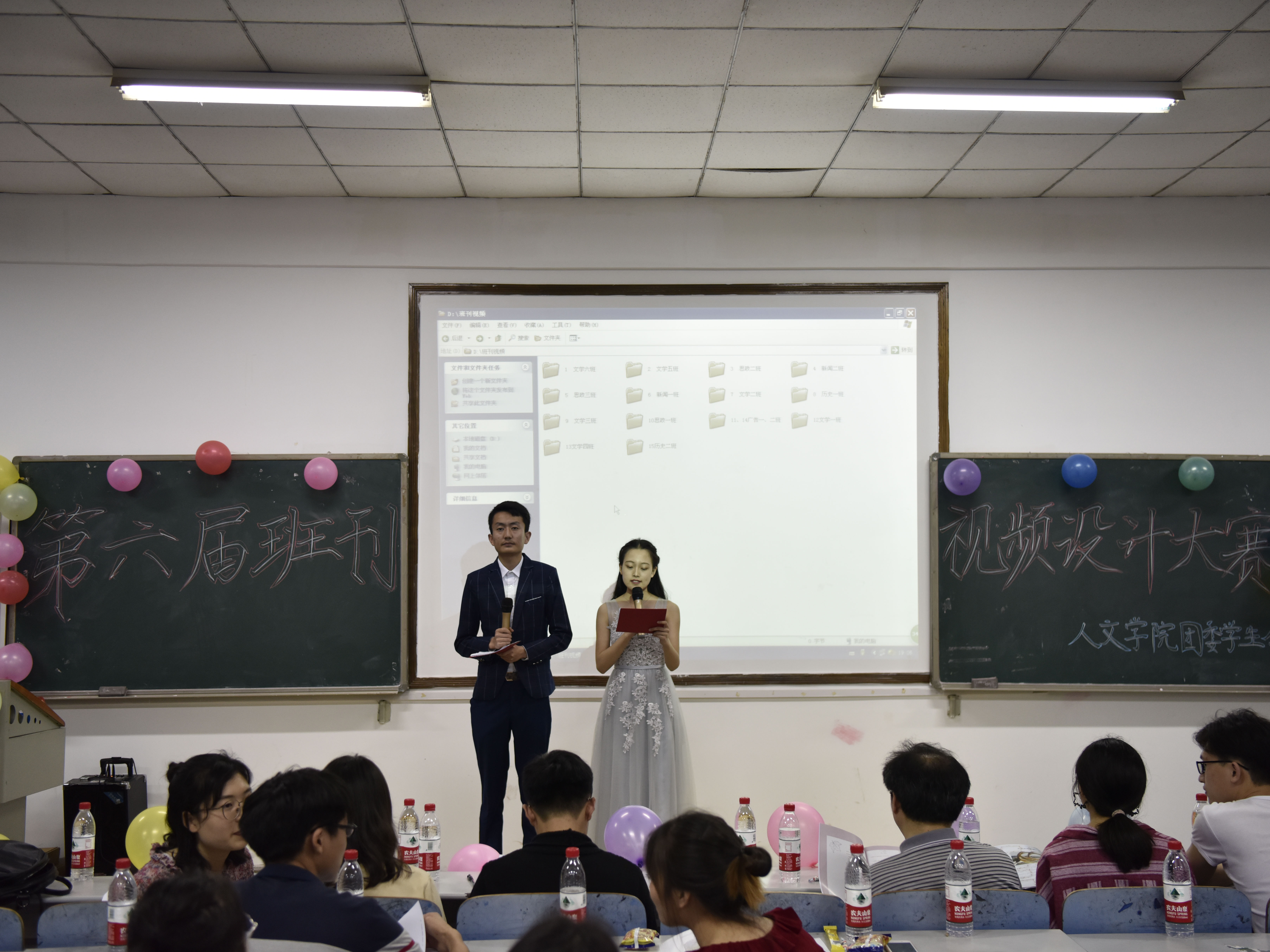 为激发学生创造与想象力,提高班级凝聚力,丰富学生大学生活,4月20日晚,第八教学楼1-3教室挂满气球彩带,迎来我院第六届班刊视频设计大赛决赛,学工办成伟明老师、赵华老师、钱子凡老师出席并担任嘉宾,研究生院主席邬林明、大学生通讯社社长彭澎以及我院学生会主席李煜、各部门部长担任评委,17级各班同学到场观看。