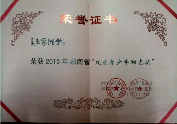 如今的她,已经是一名预备党员,近三年来,吴玉容获得了湖南省普通高校三好学生、湖南省残疾青少年励志奖、3044am永利集团官网优秀记者、3044am永利集团官网优秀共青团员等奖励。此外,吴玉容还拿到了英语四六级、三级心理咨询师、普通话二级甲等、国家计算机二级等证书。目前已与合作团队成功申请了省级科研项目,同时也被学院推优参加2017年度寻访“中国大学生自强之星”活动。