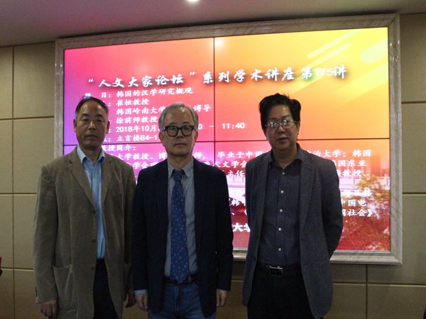 为开阔学生视野,拓宽知识面,激发学生对汉学文化的学习兴趣,使同学们更好地了解中韩之间的文化交流情况,10月31日上午,我院在立言楼4-1室开展了以“韩国的汉学研究概观为主题的学术讲座。本次讲座由韩国岭南中国语文学会理事、韩国岭南大学的教授、博士生导师崔桓主讲,徐前师教授主持。王友胜教授、颜红菊教授、梁小娟副教授、曾春蓉副教授、秦凤鹤博士、张晓燕博士、韩家俊博士等出席,汉语言文学专业的学生到场聆听。