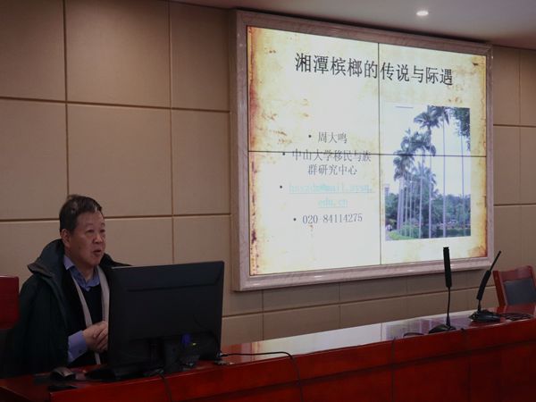 12月9日下午,教育部长江学者特聘教授、中山大学社会学与人类学学院周大鸣教授应邀于立言楼B4-1开展以“湘潭槟榔的传说与际遇”为题的学术讲座。我院李胜清教授担任主持人,廖君湘教授、罗渊教授、潘年英教授、胡铁强副教授、胡志明博士以及文艺学研究生代表和部分18级汉语言文学专业同学到场聆听。