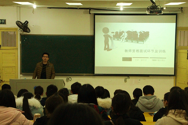 12月21日下午15时,我院于十教附一303举办关于“教师资格面试环节及训练”的培训。本次培训由胡铁强教授主持,湖南省教师资格面试考官培训老师胡天月应邀作为本次培训的主讲人,为即将面临2019年1月教师资格面试的同学们进行相关指导。