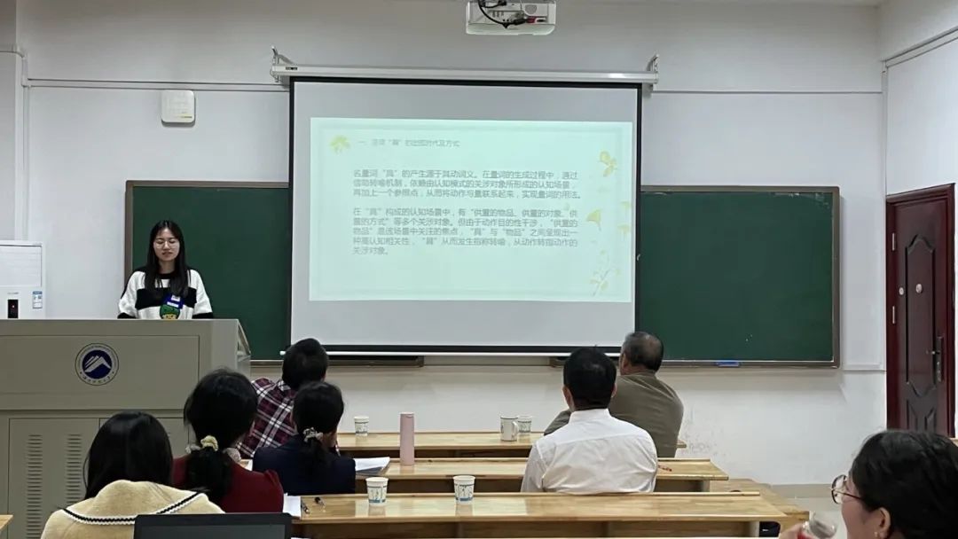 彭欣以《量词“具”的起源及历史演变》为汇报主题,徐前师老师认为可以进一步关注“具”做量词时,称量的事物本身有哪些特点以及适用于哪些场合,由此拓展研究深度。