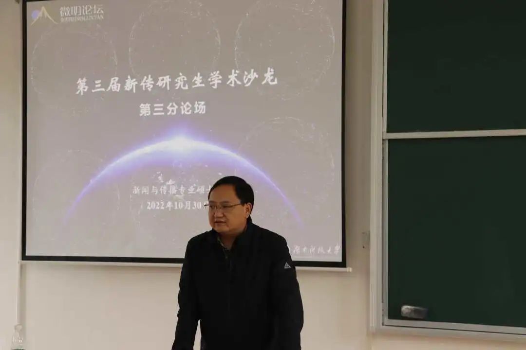 在第三分论场,13名硕士研究生聚焦算法引发的信息传播问题、新媒体语境消解现象、女性文化建构、云秀场营销创新、传统媒体市场结构失衡、灾难报道现象、人际交往行为新动向、听觉文化发展探析等议题进行了深入探讨,袁星洁老师和李胜清老师点出同学们论文撰写中存在主体模糊、理论使用范围局限、文章内容空泛等“通病”,指导学生应学会透过内容抓住本质,丰富表达方式元素,落实理论依据。现场学术气氛十分热烈。